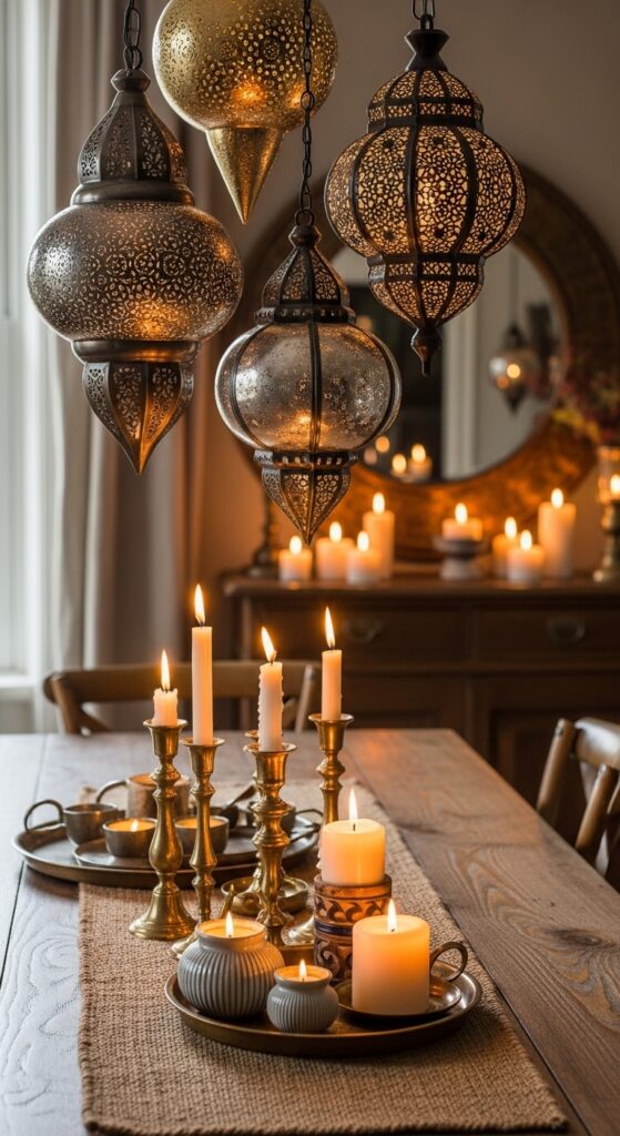 Hang Moroccan inspired lanterns at varying levels from ceiling hooks or place them on floating shelves for dramatic shadows. Choose flameless candles for safer options near fabrics and children while maintaining that warm glow. Mix metallic finishes like aged copper, brushed gold, and oxidized silver to enhance your room’s eclectic, worldly atmosphere.
