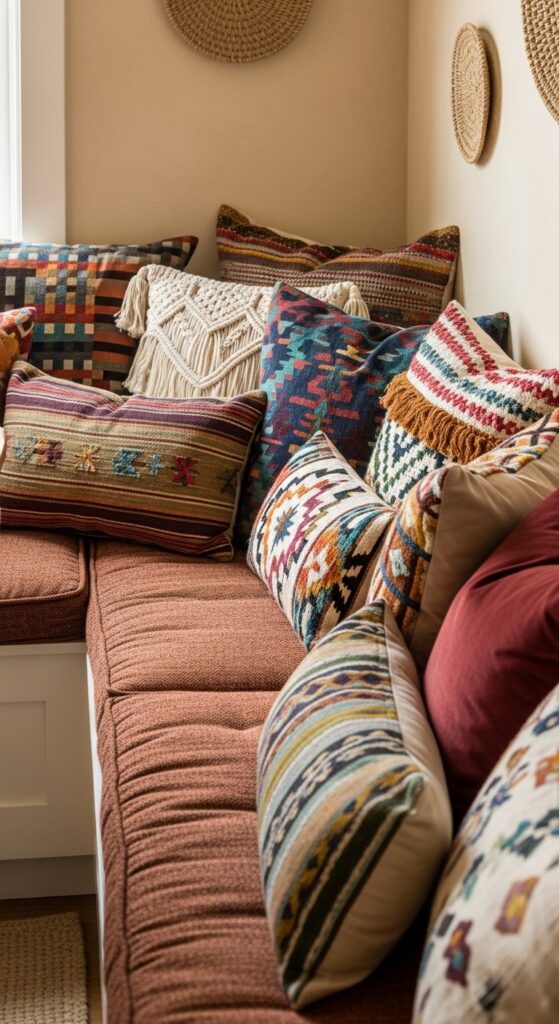 Install plush bench cushions in rich jewel tones or earthy neutrals that complement your existing décor. Layer colorful throw pillows featuring geometric patterns, tribal prints, or textured fabrics like macramé and velvet. Mix different sizes and shapes to create visual interest while maintaining comfort.