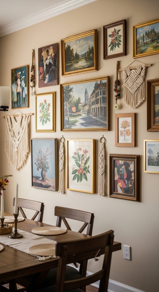 Focus on textural textile pairings by balancing smooth frames with rope-based macramé pieces, creating depth that draws the eye naturally across your dining space. Consider adding large statement pieces to anchor your gallery wall and provide a bold visual foundation that ties together smaller surrounding elements.