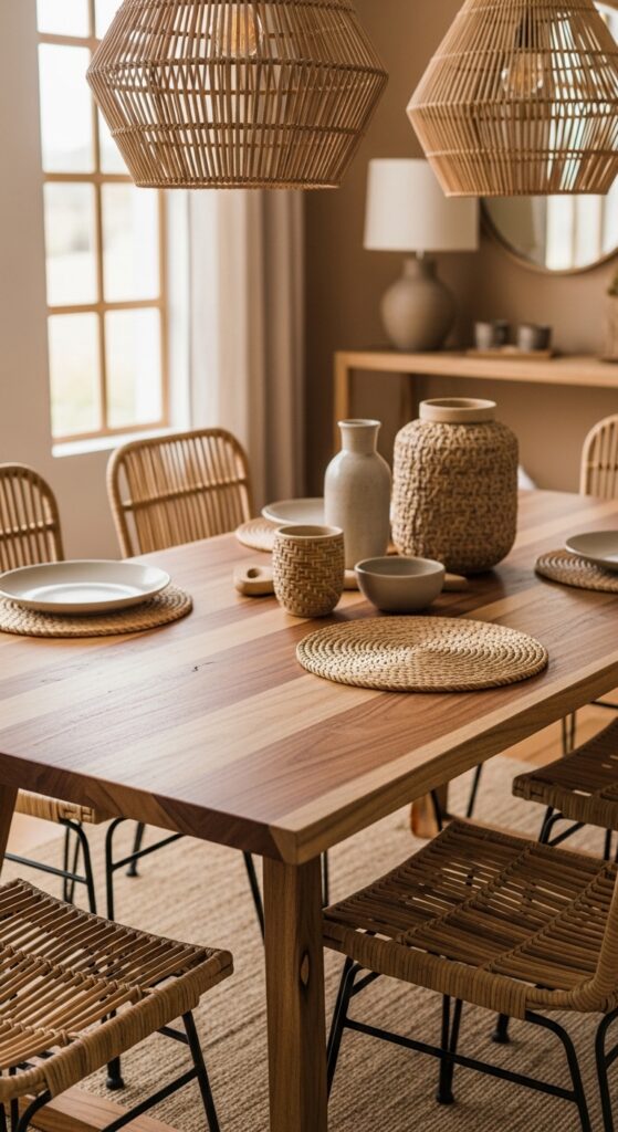 Natural wood dining tables and chairs form the foundation of your boho dining room, while strategic rattan accents bring warmth and organic texture to the space. Choose a solid wood dining table with natural grain patterns as your centerpiece.