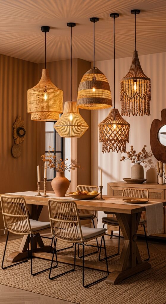 Choose organic pendant styles made from natural materials like rattan, bamboo, or jute for authentic boho appeal. Beaded designs using wood, clay, or glass add artistic dimension while filtering light beautifully. Hang multiple pendants at varying heights over your dining table to create visual interest and layered illumination.