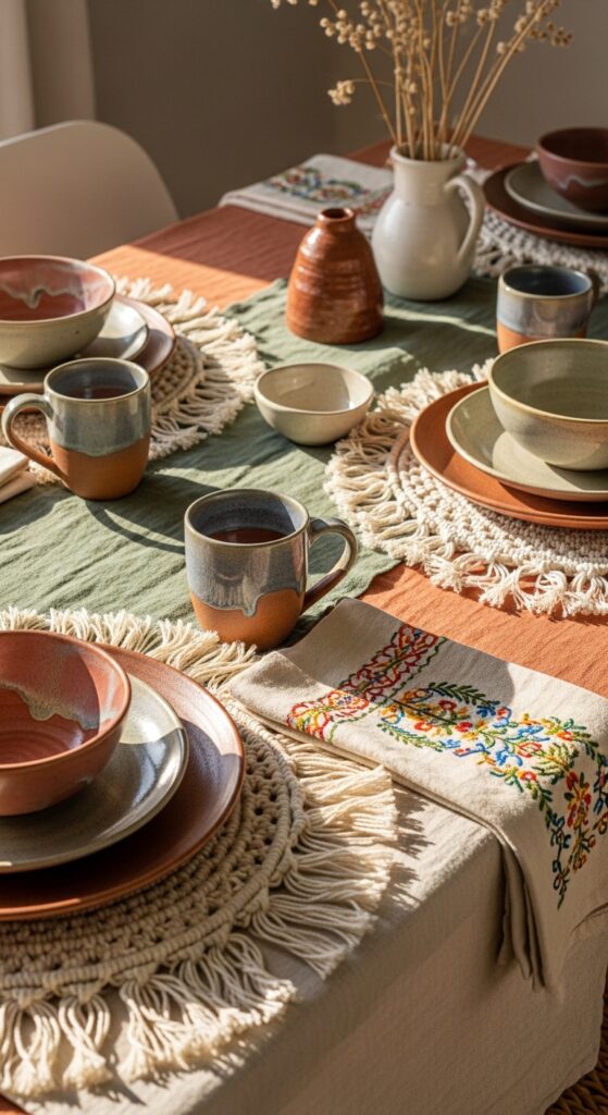 Handmade ceramics and natural linens alter your dining table into an artisanal showcase that captures bohemian style’s authentic, crafted essence. Choose irregular pottery pieces with visible fingerprints and glazing variations that tell stories of their makers.