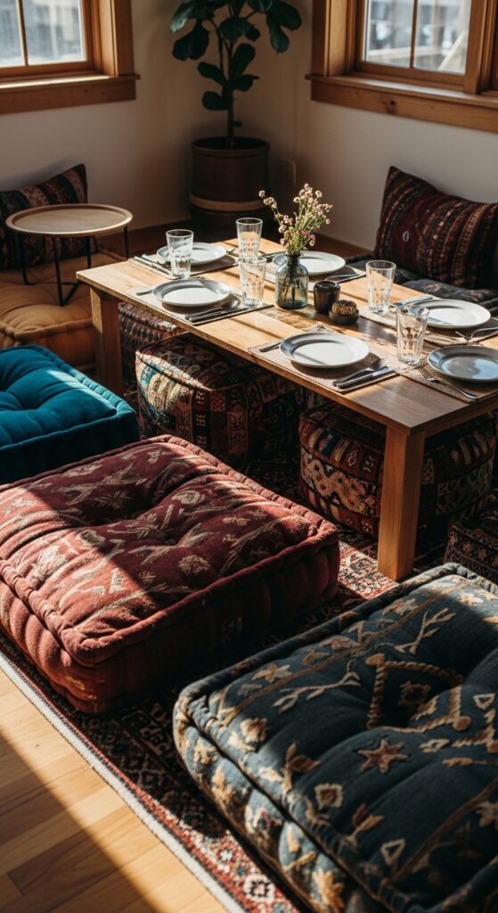 Why settle for traditional dining chairs when floor cushions can alter your space into a relaxed, globally-inspired gathering spot? Place seat cushions around a low wooden table to create an intimate, bohemian atmosphere that encourages lingering conversations.
