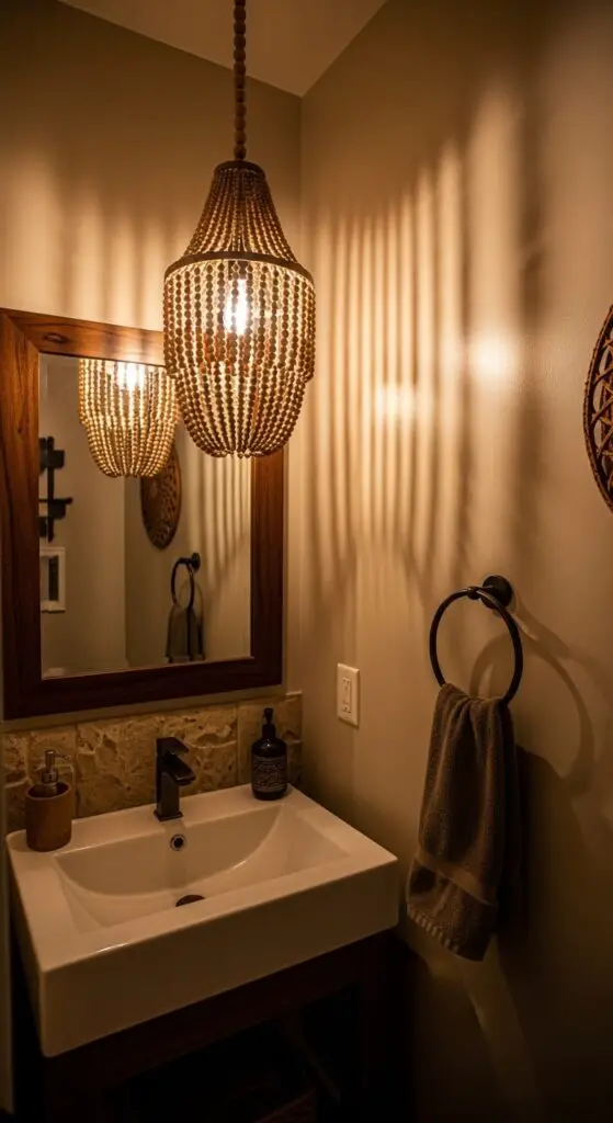 Building on your rich emerald backdrop, beaded light fixtures and pendant lamps add textural warmth that perfectly complements your boho half bathroom’s luxurious aesthetic.