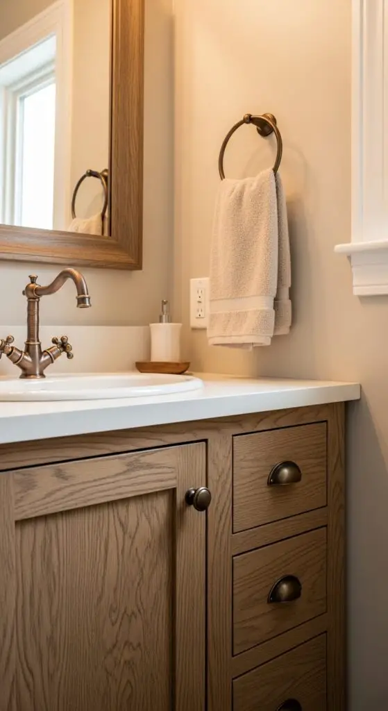 Replace standard chrome fixtures with aged brass or oil-rubbed bronze alternatives. These warm metals pair beautifully with natural wood vanities and woven baskets, enhancing your bathroom’s organic, collected-over-time aesthetic.