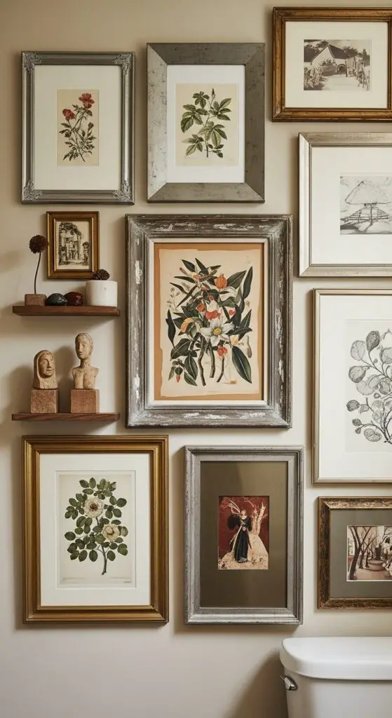 Mix photography, botanical prints, and mixed media collages to tell your story through diverse artistic expressions. Install unique display shelving between framed pieces to showcase small sculptures, crystals, or dried flowers. Layer different textures and heights to achieve that perfectly imperfect boho vibe that celebrates artistic freedom and individual expression.