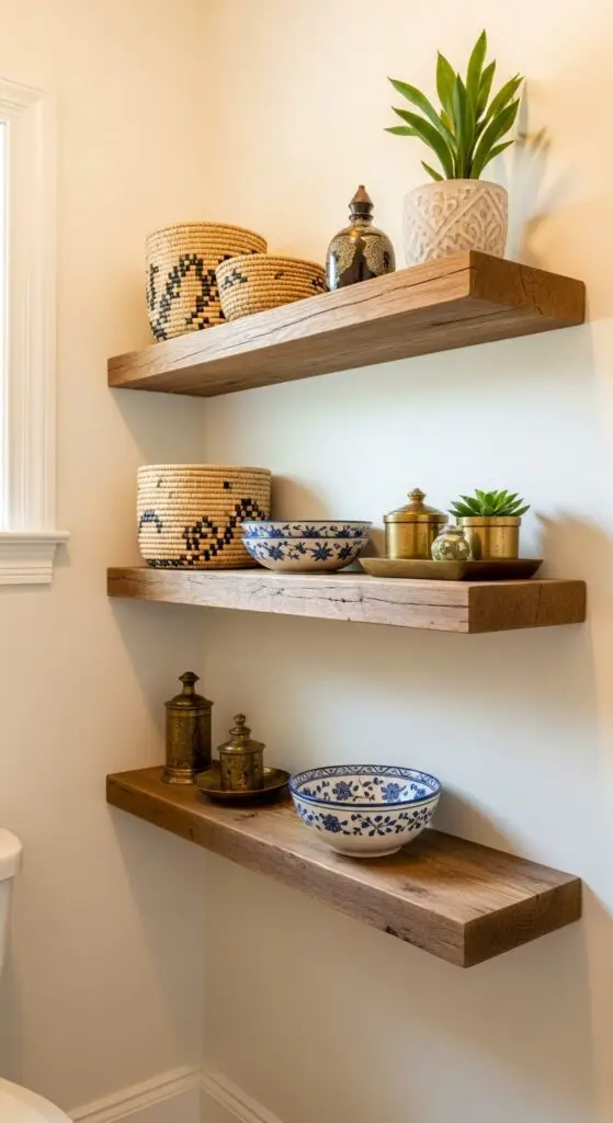 Floating shelves convert your half bathroom’s vertical space into curated displays that showcase your worldly collections and bohemian sensibilities. Choose organic wood shelving in reclaimed teak or mango wood to add natural warmth against painted walls.