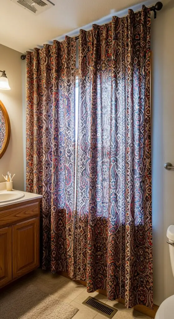 Choose rich patterns like paisley, ikat, or block prints in jewel tones that complement your existing color scheme. You’ll maximize visual impact by mounting curtain rods near the ceiling rather than directly above windows or doorways.