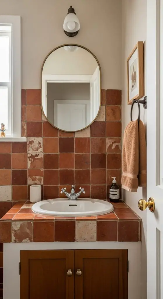 Choose irregular patterns or geometric motifs that showcase the artist’s hand rather than machine precision. Install these terra cotta accents as a feature wall behind your vanity or extend them throughout the space for maximum impact. Each tile’s subtle variations in color and texture create visual depth that mass-produced alternatives simply can’t match in your bohemian retreat. These vintage fixtures pair beautifully with hand-painted tiles to create a space that balances bohemian creativity with classic design elements.