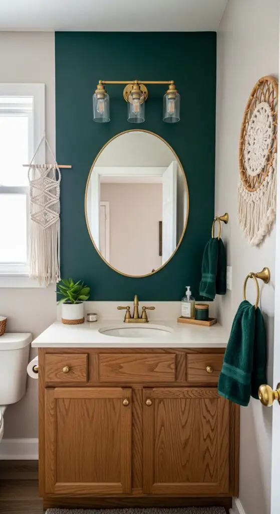 Metamorphose your half bathroom into a luxurious retreat by incorporating deep emerald accent walls that infuse rich, sophisticated color into your boho design scheme. You’ll create dramatic visual impact by painting one statement wall in deep emerald while keeping remaining walls neutral.