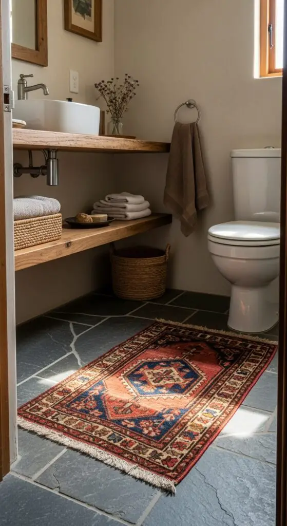 Complement your textile layers with reclaimed wood accents like floating shelves or mirror frames. These natural elements bridge the gap between your stone foundation and fabric accessories. Consider exploring different tile patterns like herringbone or chevron if you’re planning to update your underlying flooring to enhance the bohemian aesthetic. You’re creating visual depth that makes your half bathroom feel intentionally curated rather than hastily decorated.