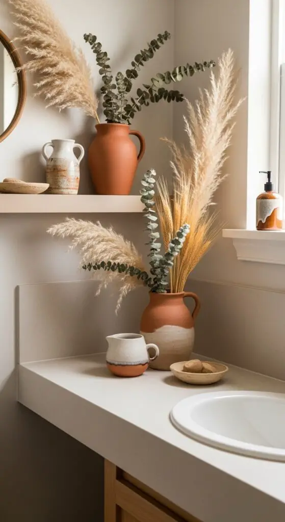 Natural textures extend beyond storage solutions to encompass decorative elements that breathe life into your boho half bathroom. Pampas grass creates stunning focal points when arranged in handcrafted ceramic vessels on floating shelves or countertops.