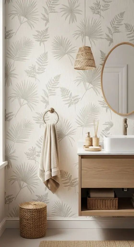 When selecting textured wallpaper with botanical motifs, you’ll convert your boho half bathroom into a nature-inspired sanctuary that breathes life into compact spaces. Choose textured wallpaper patterns featuring palm fronds, monstera leaves, or delicate ferns to create visual depth while maintaining your space’s organic flow.