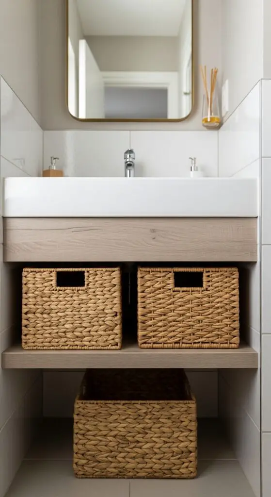 Position medium-sized baskets beneath floating vanities or inside open shelving units for maximum functionality. The woven texture contrasts beautifully against smooth bathroom surfaces like ceramic tiles or painted walls, creating visual interest without overwhelming your compact space.
