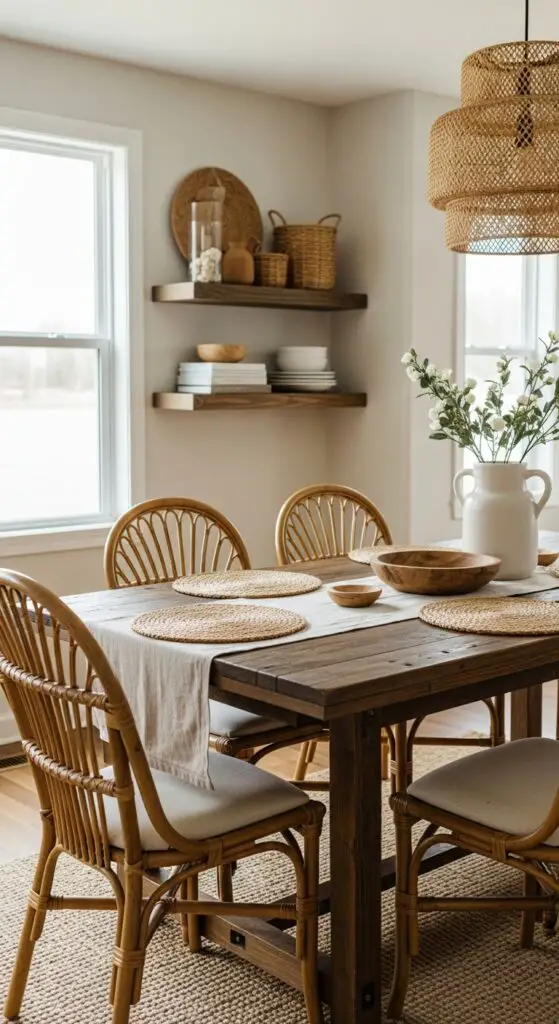 Mix different wood finishes and weaving patterns to avoid monotony while maintaining a cohesive, relaxed atmosphere that encourages lingering conversations. Drawing from farmhouse dining room inspirations, these classic natural elements create the perfect foundation for rustic elegance in your everyday dining space.
