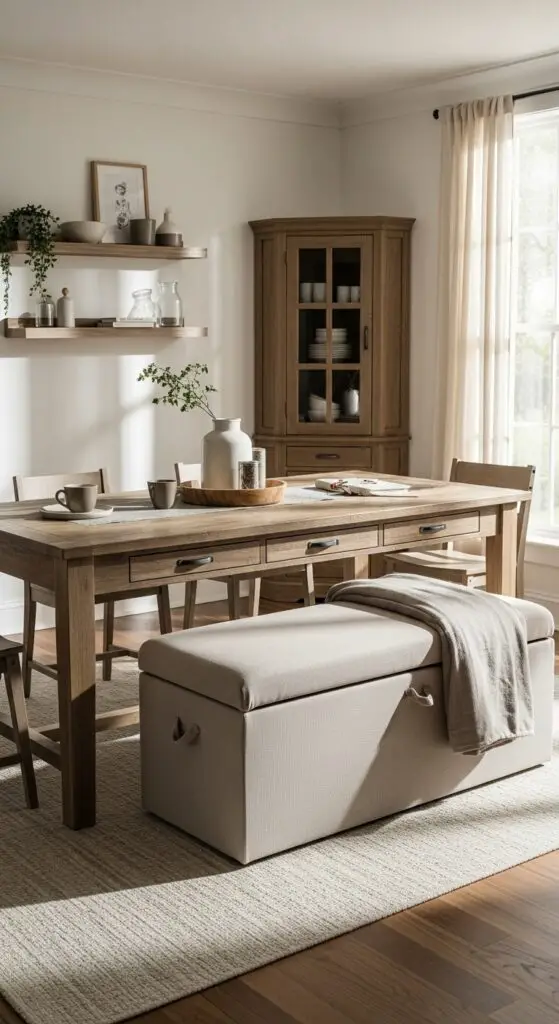 Choose furniture pieces that multitask—ottoman storage benches provide extra seating while hiding games, chargers, and other daily essentials you use regularly.
