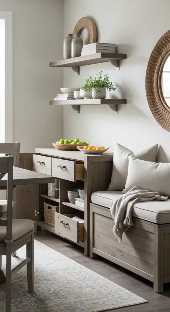 Install floating shelves with hidden brackets to display decorative items while concealing bins underneath for papers and supplies. Streamlined storage solutions like sideboards with interior compartments handle table linens, electronics, and seasonal items effortlessly. Compact cabinet designs specifically created for small spaces can provide extensive storage capacity while maintaining clean lines that complement your casual dining aesthetic.