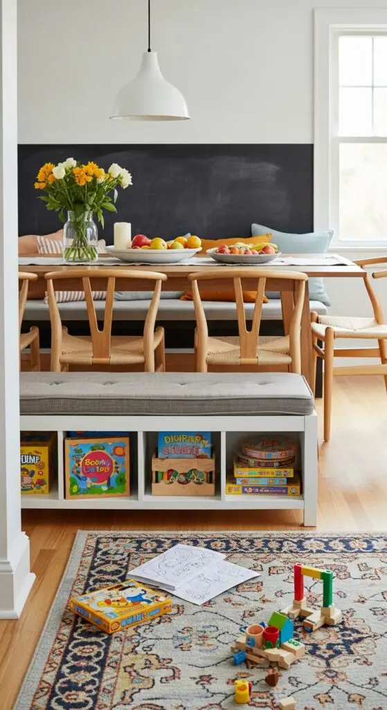 Consider adding a low storage bench filled with quiet activities like coloring books and puzzles near the dining table. Install customized kid friendly features such as washable wall decals at their eye level or a small chalkboard corner for creative expression.