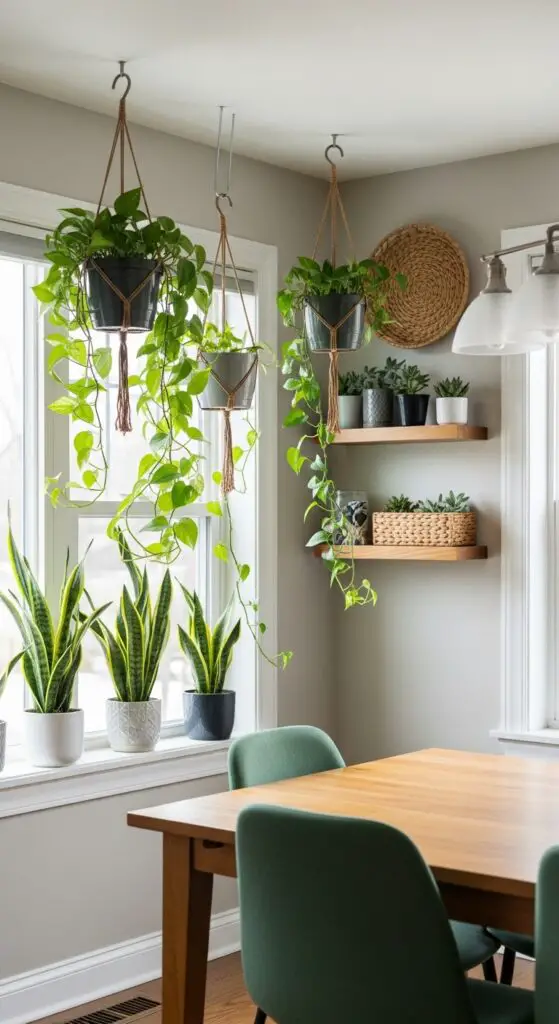 Consider hanging plants from ceiling hooks or wall-mounted brackets to maximize floor space while adding vertical interest. Trailing vines like pothos or ivy cascade beautifully from elevated positions, creating natural curtains that soften harsh corners.
