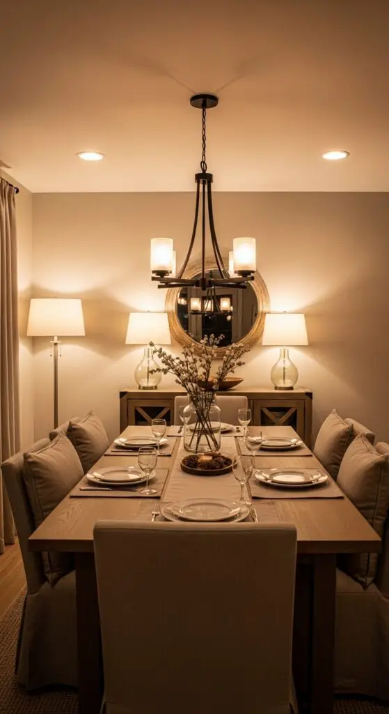 Comfortable seating sets the foundation for family gatherings, but thoughtful lighting alters your dining space into an inviting evening retreat. You’ll want to combine multiple light sources for maximum flexibility and warmth.
