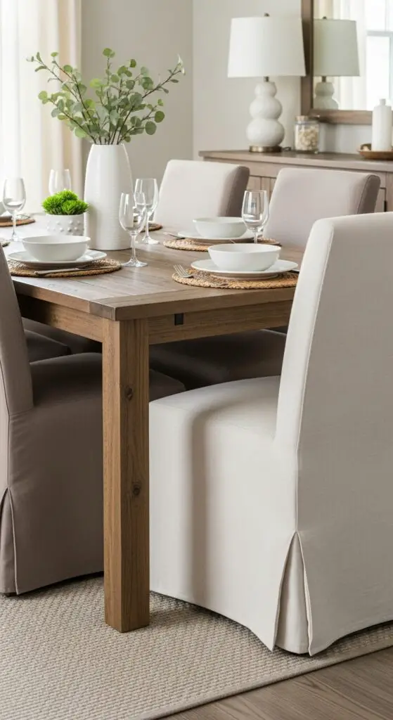Opt for tables with low maintenance finishes such as sealed wood, laminate, or metal surfaces that wipe clean easily. Consider washable slipcovers for chairs that you can toss in the machine after messy meals. For compact spaces, select properly sized rugs that fit your dining area layout while still providing easy-to-clean flooring protection. These smart material choices let you enjoy relaxed family time without constantly worrying about protecting your furniture.
