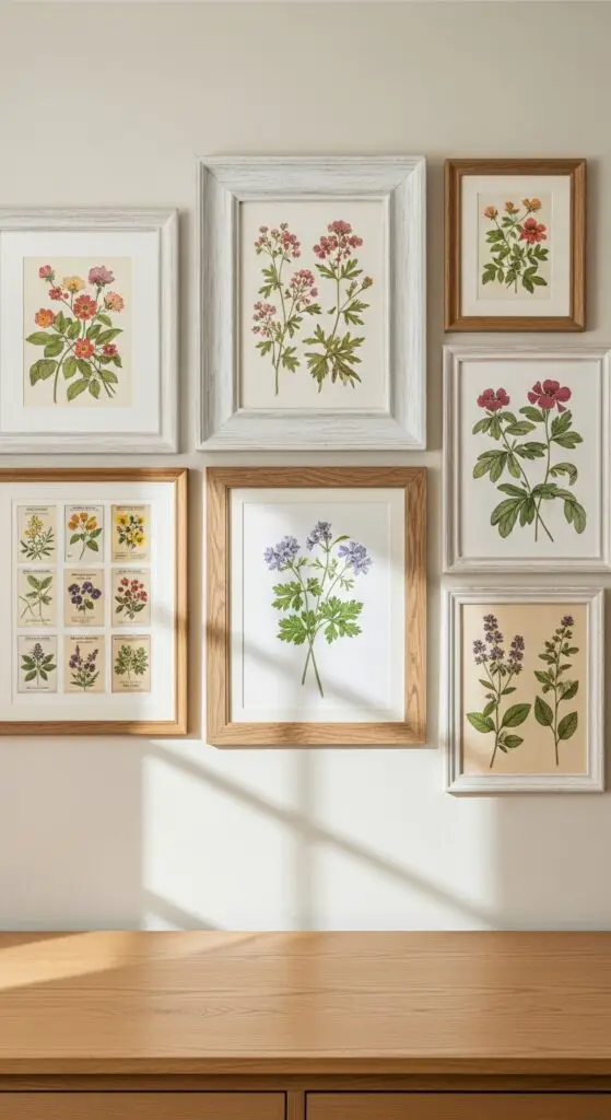 Mix watercolor botanicals with antique seed packet reproductions for authentic cottage charm. Your natural botanicals display works beautifully when you layer different frame sizes and finishes—think weathered white alongside natural wood tones.