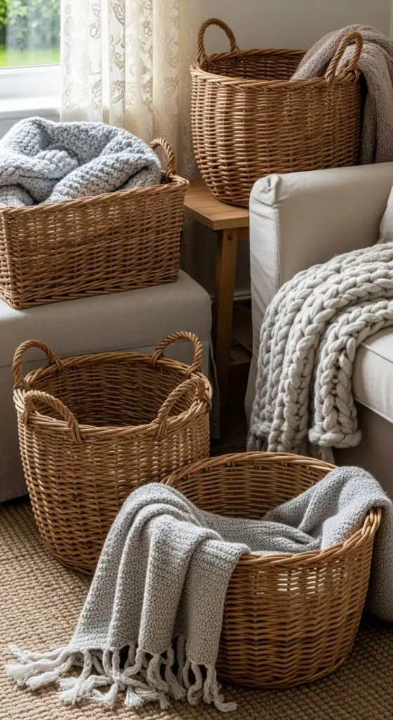 Layered Textures Through Woven Baskets and Throws