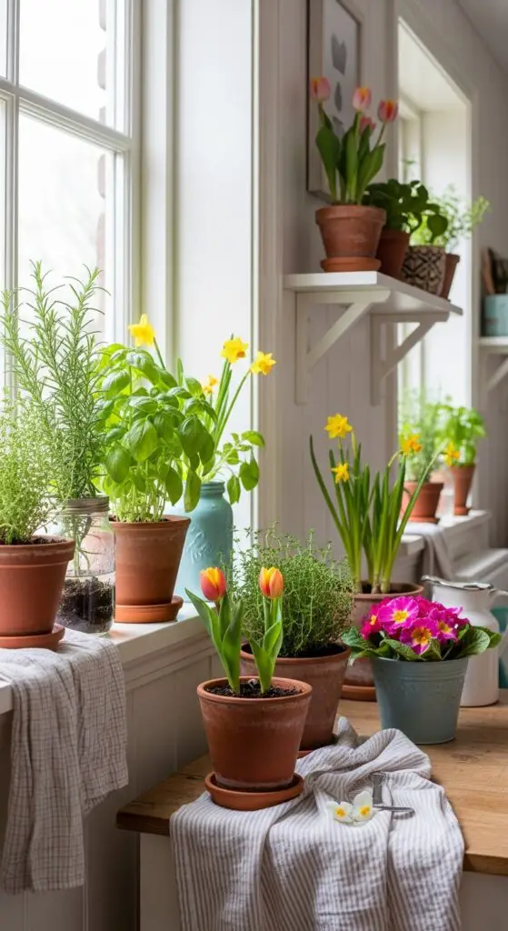 Add colorful spring plants like miniature daffodils, primroses, and small potted tulips to create cheerful focal points. These seasonal bloomers pair beautifully with your soft lighting fixtures, casting gentle shadows that dance across textured walls and creating that authentic cottage charm you’re seeking.
