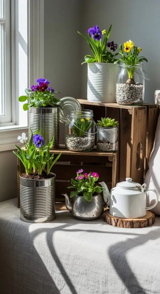 Revamp repurposed glass jars into charming herb gardens by drilling drainage holes and adding pebbles for proper water flow. Vintage tin containers work beautifully for displaying small succulents or vibrant spring flowers on windowsills and shelves.