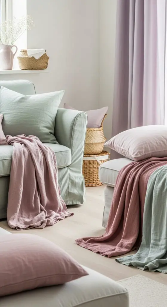 Mix wicker baskets in varying sizes for storage and style, then incorporate linen throws in soft pastels. The key is combining rough and smooth textures that invite touch while maintaining that effortless cottage charm you’re seeking.