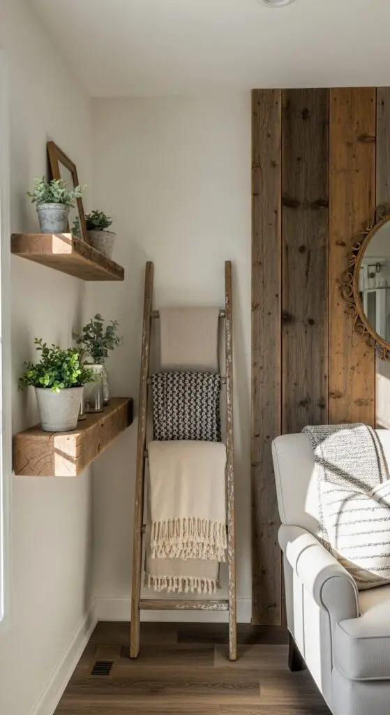 You can easily achieve this look by selecting pieces with distressed wood finishes that complement your existing palette. Consider adding a weathered wood ladder for displaying throws, rustic wooden bowls filled with fresh greenery, or barn wood accent walls that create instant cottage charm without overwhelming your space. Incorporating vintage touches alongside these weathered wood pieces helps create that timeless rustic spring aesthetic that feels both comfortable and authentically aged.