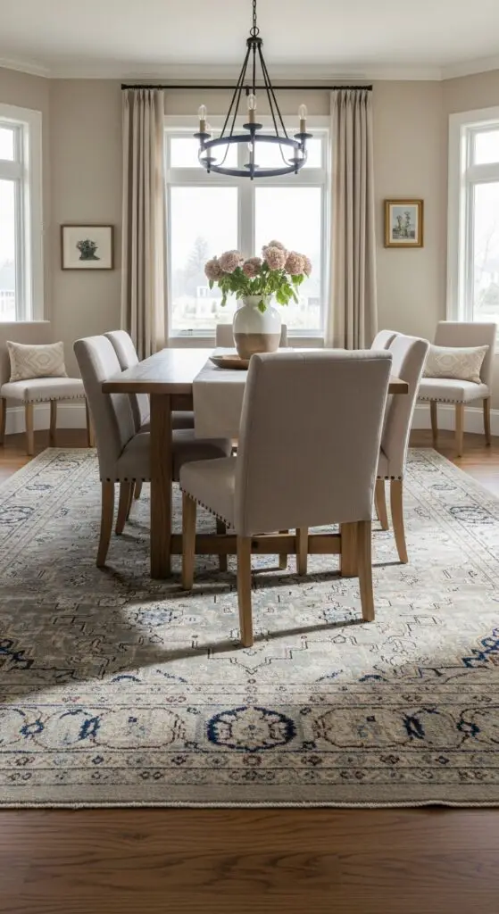 Beyond illuminating your dining space beautifully, you’ll need to ground the room with a carefully chosen statement rug that defines your dining area’s boundaries. Select a rug that extends at least 24 inches beyond your table’s edges, allowing chairs to remain on the surface when pulled out.