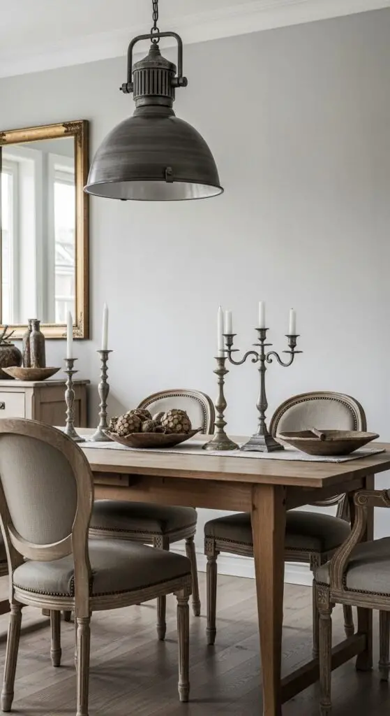 When you combine vintage treasures with contemporary furnishings, you’ll create a dining room that tells a story while meeting modern lifestyle demands. Start by anchoring your space with one statement piece—perhaps a mid-century modern table paired with antique chairs, or sleek contemporary seating around a rustic farmhouse table.