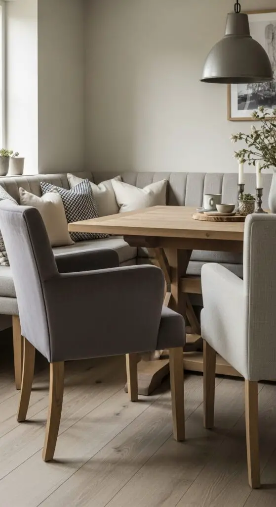 Instead, invest in plush upholstered chairs with supportive backs and armrests that cradle your guests. Consider adding cozy bench seating along one wall, complete with throw pillows for extra comfort. Mix textures like velvet, linen, or leather to create visual interest while maintaining that inviting feel that encourages people to relax and truly enjoy their dining experience.