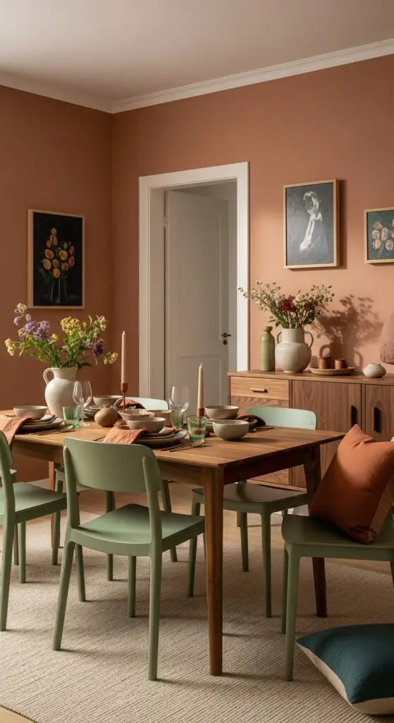 The right color palette alters your dining room from ordinary to extraordinary by creating an atmosphere that naturally draws people in and makes them want to linger. You’ll find that warm colors like burnt orange, deep burgundy, and golden yellow instantly metamorphose your space into a welcoming retreat.