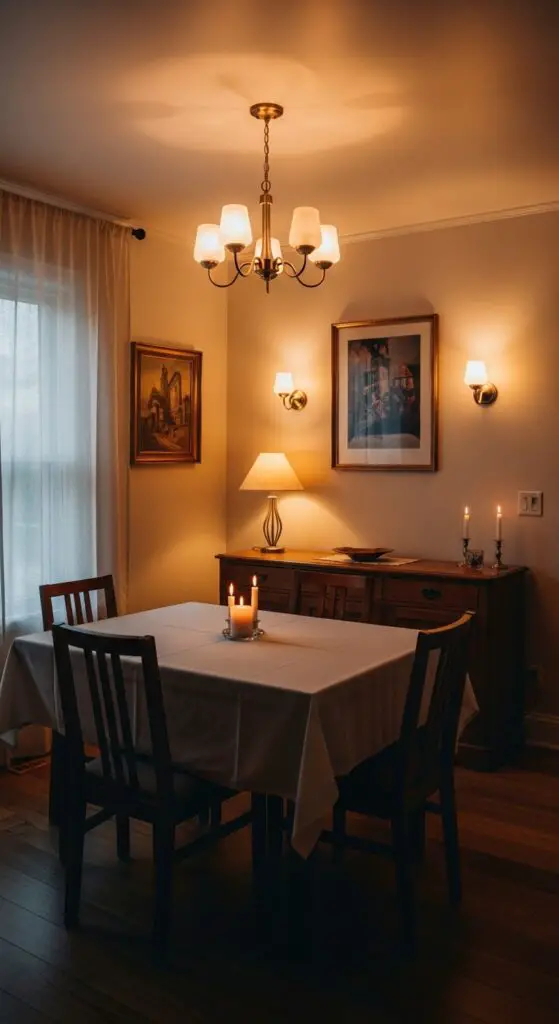 Harness wall sconces flanking artwork or buffets to create gentle pools of ambient light that soften harsh shadows. Add table lamps on sideboards and floor lamps in corners to establish depth and visual interest. Consider smaller-scale chandeliers that bring elegance to intimate spaces while maintaining proportional balance with your room size. Candles on your dining table provide the ultimate cozy finishing touch, casting flickering warmth that metamorphoses ordinary meals into memorable experiences.
