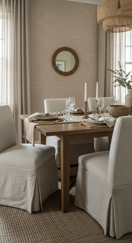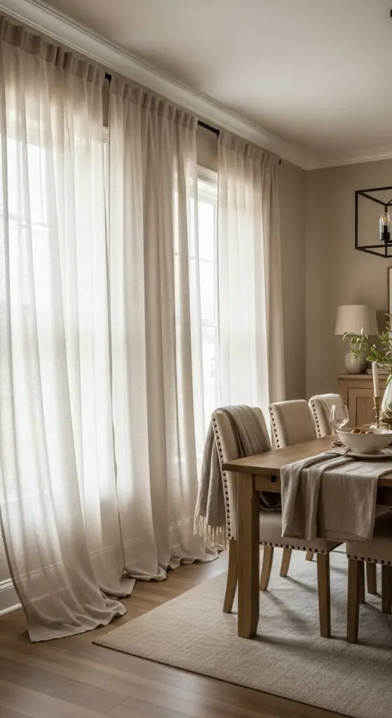 Something as simple as adding curtains or drapes can alter your dining room from stark and formal into a warm, inviting sanctuary where guests linger long after dessert. You’ll create instant softness that breaks up hard lines from furniture and walls while establishing intimate boundaries around your eating space.