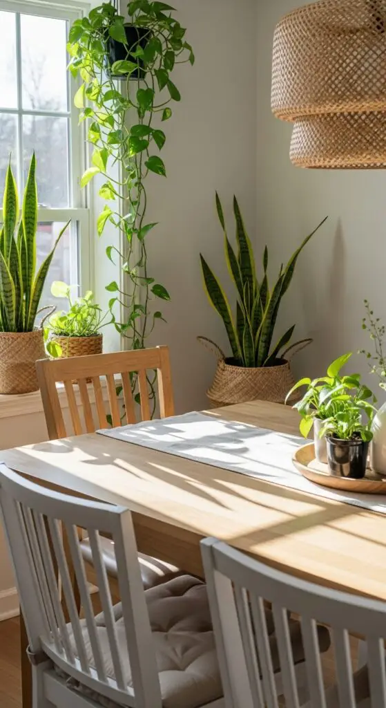 Adding live plants to your dining room instantly alters the space from a simple eating area into a lively, welcoming environment that feels connected to nature. Place trailing pothos in cozy window nooks where morning light creates stunning shadows across your table.