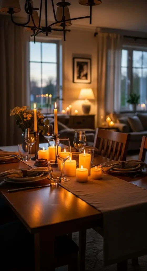 LED candle displays provide consistent illumination without fire hazards, making them perfect for homes with children or pets. You can arrange flameless candle centerpieces across your table’s length, creating layers of gentle light that won’t drip or burn out mid-meal.