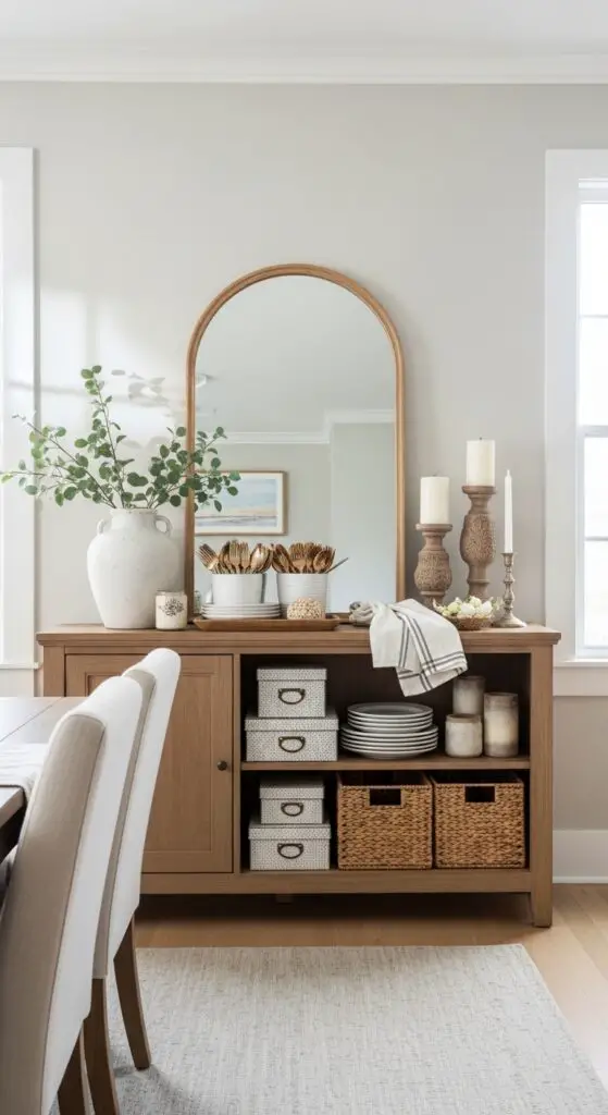 Beyond seasonal styling lies a practical challenge that many homeowners face: storing necessary dining items while maintaining your buffet’s polished appearance. You’ll want to curate concealed storage that serves your dining needs while preserving visual appeal.