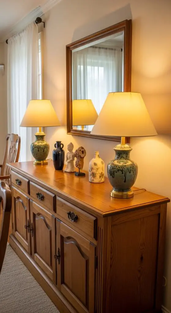 Table lamps metamorphose your buffet from merely functional furniture into a welcoming focal point that radiates sophistication throughout your dining space. When you place table lamps strategically on either end of your buffet, you’ll create perfect symmetry while providing gentle illumination for evening gatherings.