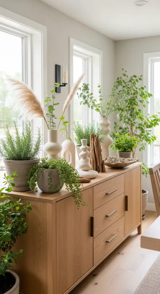 Fresh plants and natural elements breathe life into your dining room buffet while creating an organic connection between your indoor space and the outdoors. You’ll find that potted herbs like rosemary or eucalyptus add subtle fragrance while remaining practical for cooking.