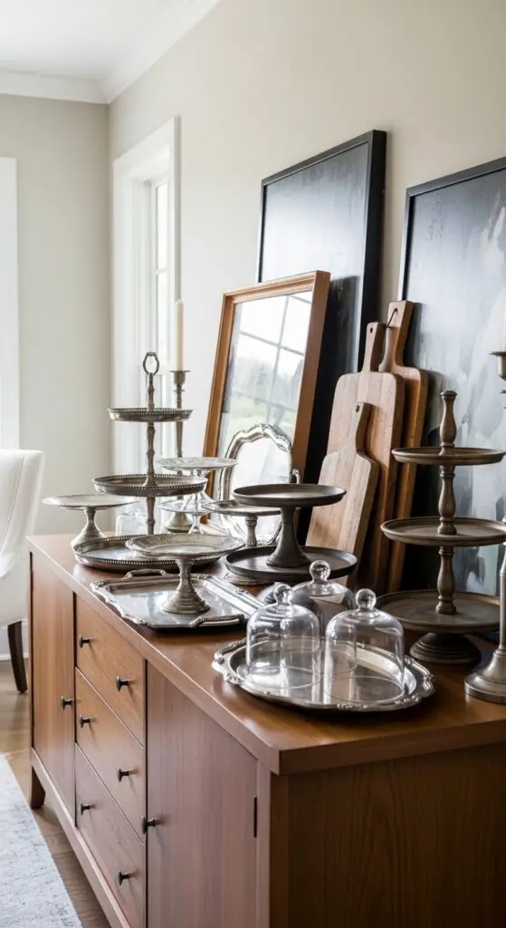 Stack different-sized platters vertically against the wall, then lean artwork behind them for added depth. Incorporate multifunctional decor items such as wooden cutting boards that double as serving pieces and decorative elements. Glass cloches protect special items while maintaining visibility.
