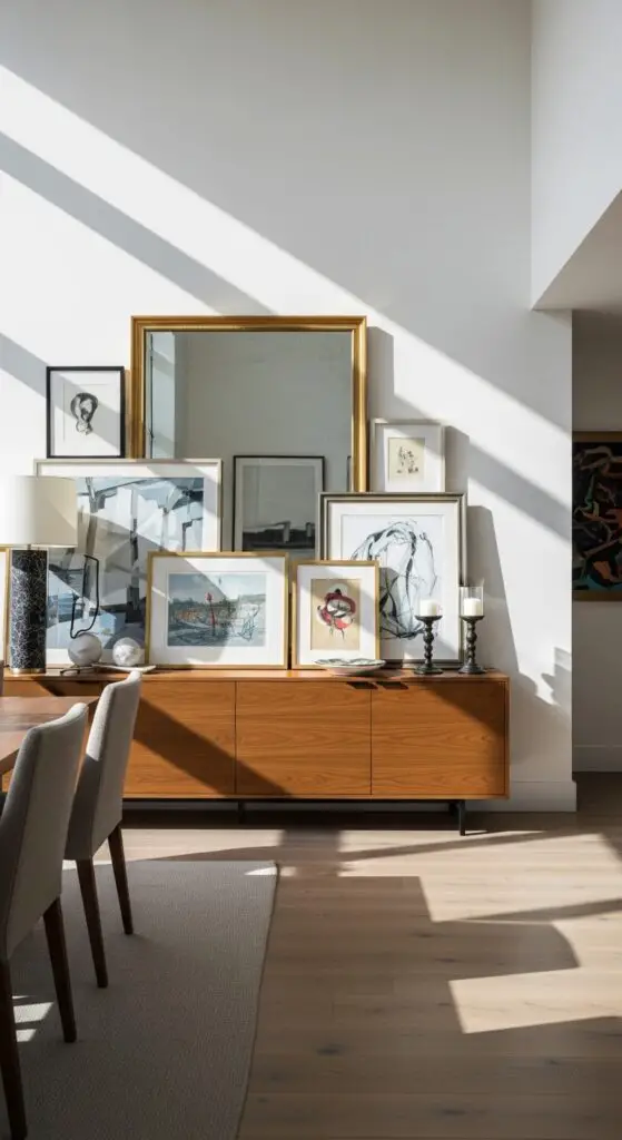 Mirrors amplify light and make your dining space feel larger while reflecting your carefully arranged items from multiple angles. Consider strategically placed shelving to showcase smaller art pieces between larger focal points. Unique framing options like vintage frames or floating acrylic displays add personality without overwhelming your buffet’s clean lines and functional beauty.
