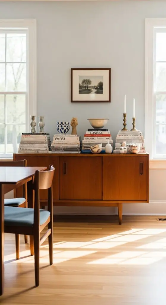 Building on this foundation of visual depth, you’ll want to incorporate carefully selected books and decorative objects to add personality and texture to your buffet arrangement. Group items in odd numbers—three or five pieces work beautifully together. Stack coffee table books horizontally, then place a small sculpture or vase on top for height variation.