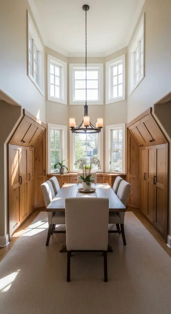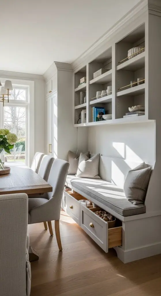 Consider incorporating built in bench seating along one wall, creating both comfortable dining space and hidden storage underneath. Add concealed storage drawers behind cabinet doors to organize linens, serving pieces, and seasonal items without cluttering your dining area. Built-ins eliminate gaps between furniture and walls, giving you every available inch for storage. Smart storage features like pull-out shelves and compartmentalized drawers help keep compact dining rooms organized and functional.