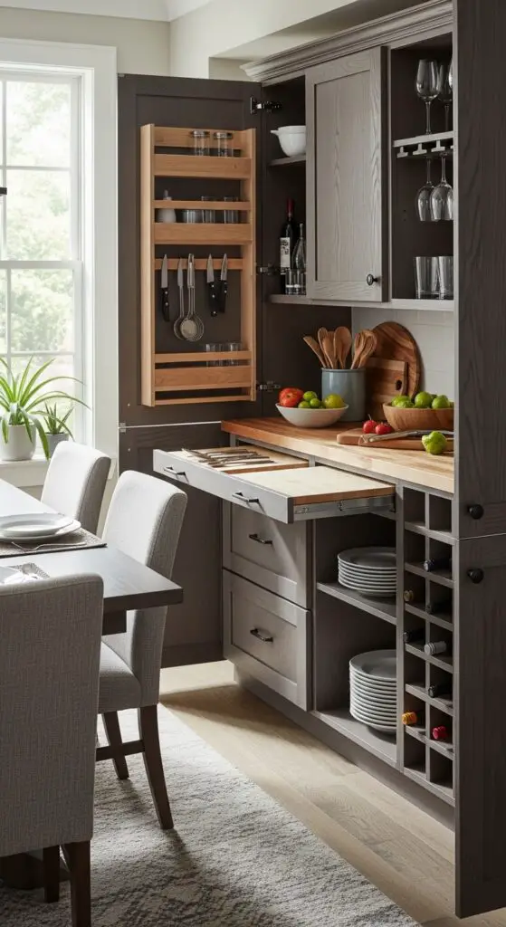 Multi purpose serving stations combine closed cabinet storage with open countertop workspace, giving you room to prep appetizers while keeping dishes hidden. Look for pieces with integrated countertop storage features like built-in wine racks or pull-out cutting boards that maximize functionality.