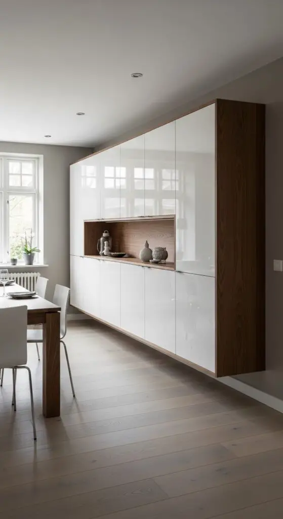 Modern floating cabinets offer a striking contrast to traditional hutch designs, bringing contemporary sophistication and visual lightness to your dining space. These wall-mounted units create a minimalist aesthetic that doesn’t overwhelm smaller rooms while maximizing floor space underneath.