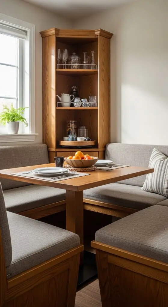 Choose triangular designs that fit snugly into tight corners, or select curved units that soften sharp angles. Space saving cabinet designs include built-in lazy Susans for easy access to stored items and adjustable shelving for versatile organization. Consider pairing your corner cabinets with banquette seating to create a cohesive breakfast nook that serves dual purposes.