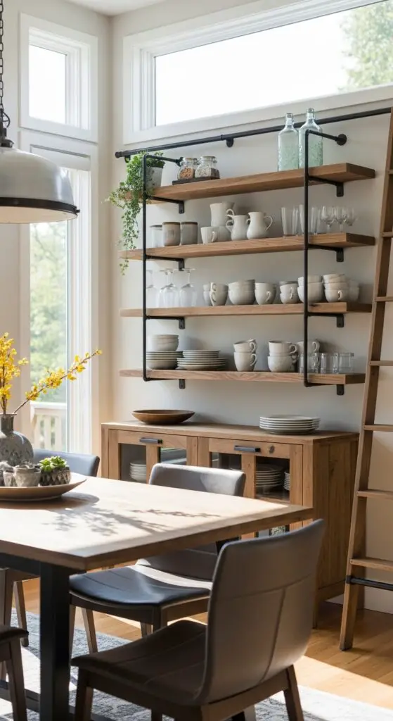 Open shelving cabinets alter your dining room storage into an accessible showcase that blends functionality with visual appeal. You’ll enjoy effortless access to everyday dishes, glassware, and decorative pieces without fumbling through closed doors.